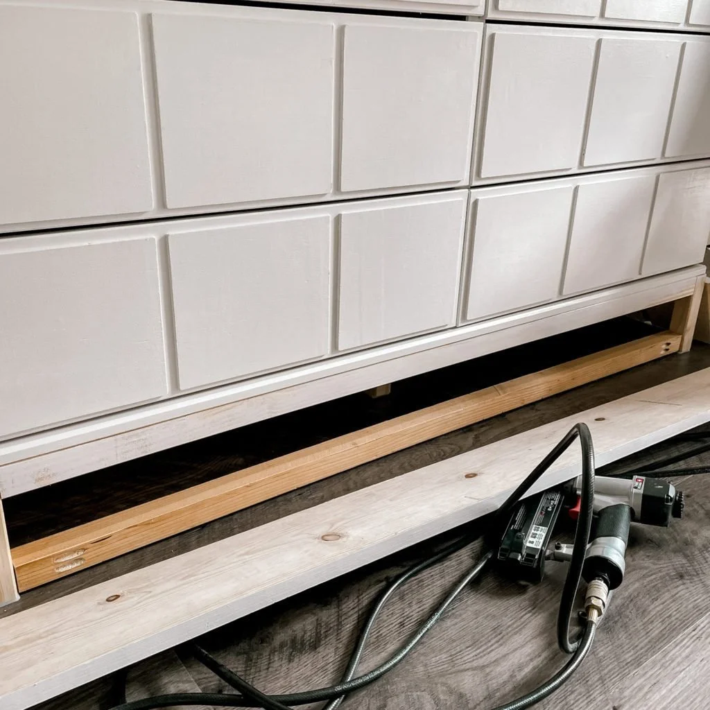The last thing was the baseboards. For this one in our room, we decided to keep the legs attached because we needed the extra height for our tv {any lower and our bed frame would cut off the tv when laying in bed}. We used a 1" x 8" trim for this and it fit perfectly. We first added a scrap piece of wood on the bottom to help secure the baseboard.